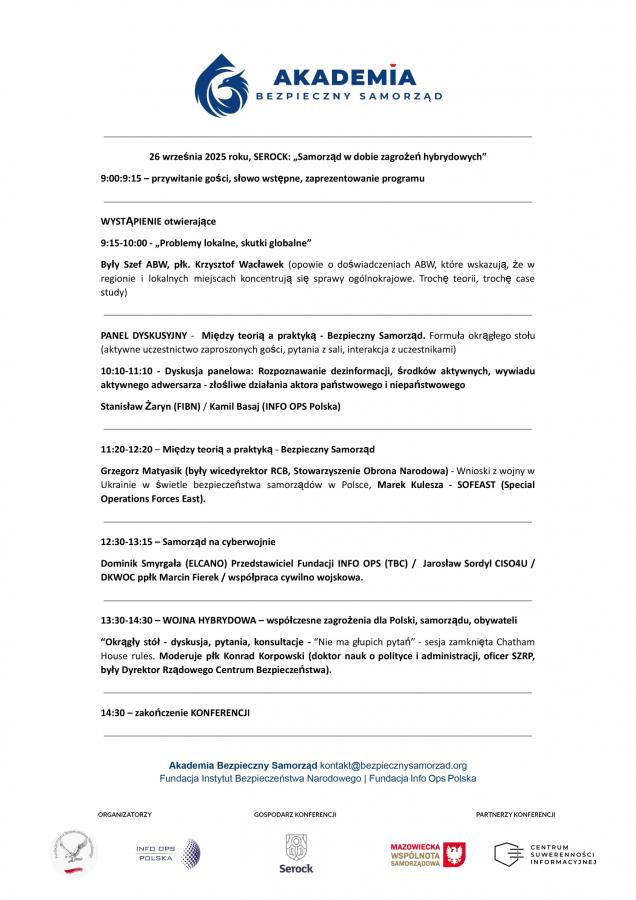 Zapraszamy do obejrzenia galerii zdjęć z konferencji Samorząd w dobie zagrożeń hybrydowych. Wydarzenie odbyło się 26 września 2025 r. w Hotelu Windsor w Jachrance. Na konferencji rozmawiano o roli samorządów w zwalczaniu współczesnych zagrożeń. Partnerem wydarzenia była Mazowiecka Wspólnota Samorządowa, a współorganizatorami: Akademia Bezpieczny Samorząd, Fundacja INFO OPS Polska oraz Fundacja Instytut Bezpieczeństwa Narodowego. Na spotkaniu wzięli udział eksperci z doświadczeniem w strukturach bezpieczeństwa narodowego, m.in. byli Szefowie Agencji Bezpieczeństwa Wewnętrznego i Rządowego Centrum Bezpieczeństwa. Oto kilka ujęć z tego inspirującego wydarzenia!